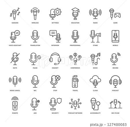 collection microphone icons concepts like education podcasting audio settings, stop record cloud conference