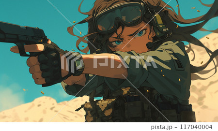 銃を携行して射撃ポーズをとるアニメの軍事キャラクター