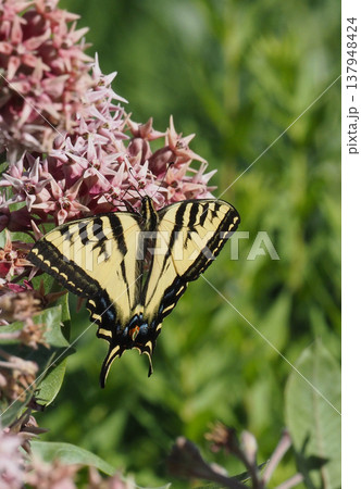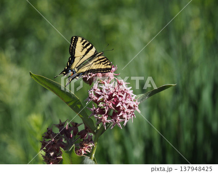 ミルクウィードの花にとまるトラフアゲハチョウ