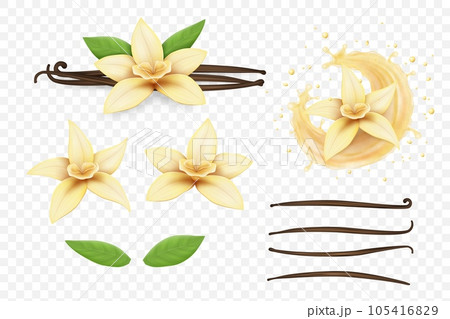 Vanilla flower. Milk splash, bean, pods and sticks, realistic isolated on transparent background elements, flavour cream, perfume aroma, liquid drops. Food and cosmetics packaging. Vector set