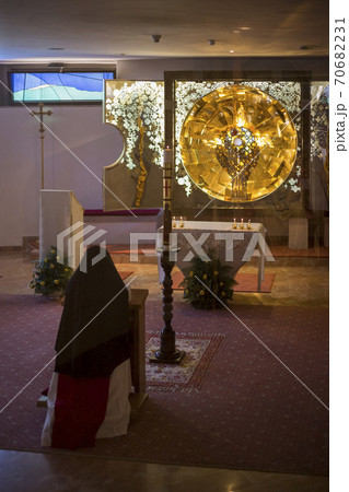 A Catholic nun is praying on her lap at Milk Grotto Church. Bethlehem.