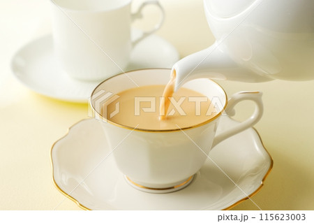 白いカップに入った紅茶にミルクを注いでいるところ