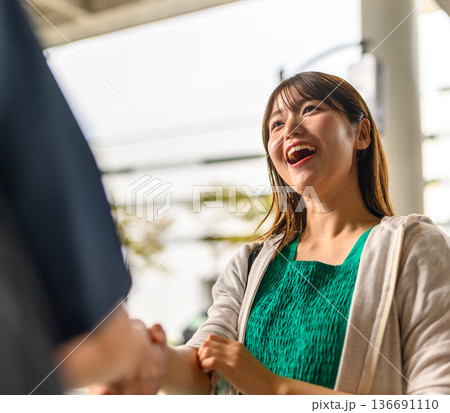 笑顔で握手するビジネス女性 ■撮影協力:関西国際空港(KIX)