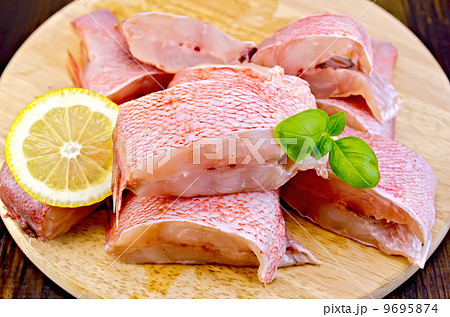 Fillet of sea bass with basil on board
