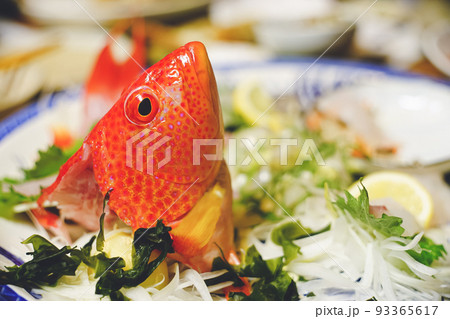 沖縄県宮古島の海釣りで釣り上げた高級魚アカジンミーバイのお造り 尾頭つき