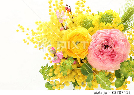 ラナンキュラスと菜の花とミモザと桃のアレンジ(横 部分)