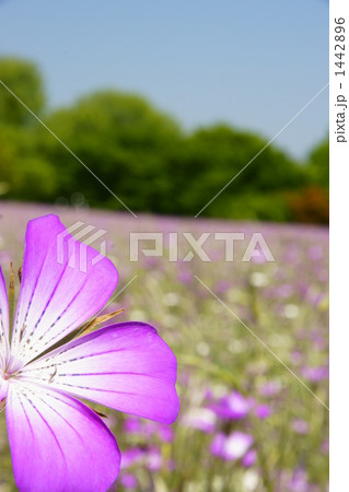 薄紫色のアグロステンマの花が咲く広い原っぱ