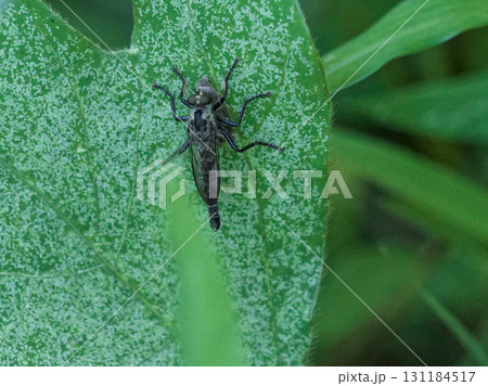 葉に止まるムシヒキアブ科アオメアブ