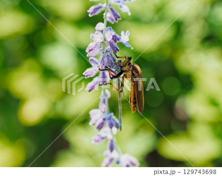 花に止まるムシヒキアブ科アオメアブ