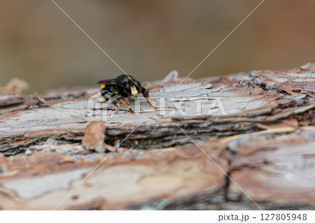 切株に止まるムシヒキアブ科オオイシアブ