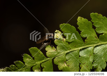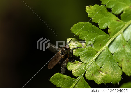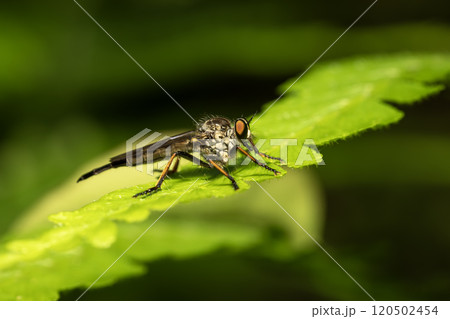 葉に止まるムシヒキアブ科マガリケムシヒキ♀
