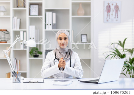 Portrait of serious asian muslim female doctor in hijab sitting at table in hospital office with stethoscope around neck, arms folded, looking at camera.