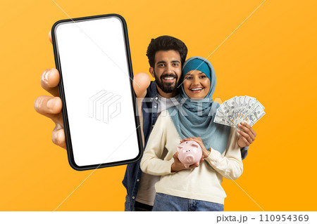 muslim couple holding cash showing large smartphone over yellow backdrop
