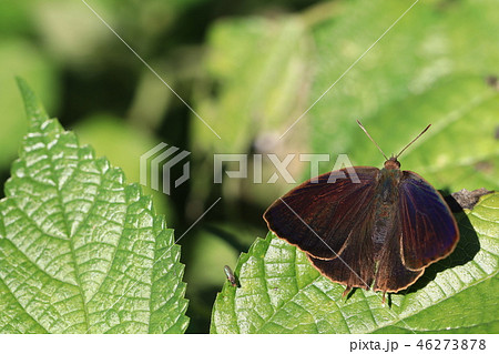 生き物 昆虫 ムラサキツバメ、美しい翅表に対して地味な翅裏。この状態ではオス、メスの判別は不可能?