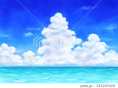 アナログ水彩風の青い空と入道雲と青い海