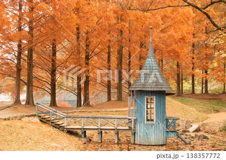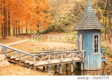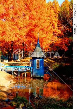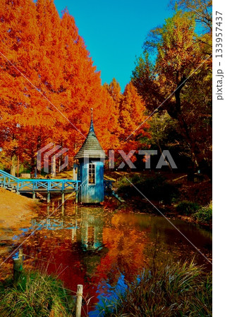 紅葉のあけぼのこどもの森公園 池の上の青い建物と黄色いメタセコイア