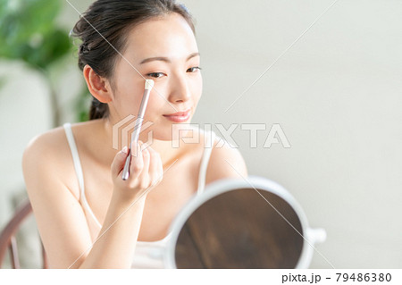 Beautiful asian woman holding make-up brush. Beauty and Healthy concept