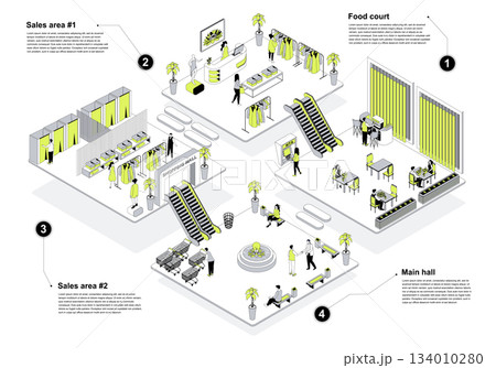 Shopping mall 3d isometric concept in outline design for web. People in isometry rooms buying at food court and clothing store with sales areas, waiting and resting at main hall. Vector illustration.