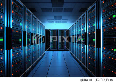 Dark server data center room with computers and storage systems in blue shades. AI Generative