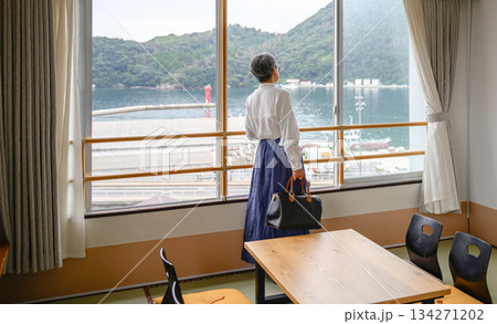 窓辺で景色を眺める高齢女性