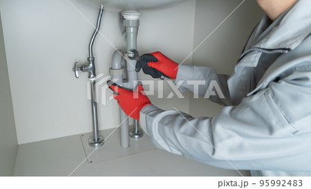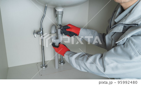 洗面台下の配管修理イメージ|スパナを持った作業員