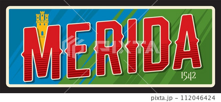 Merida Mexican city and capital of Yucatan state. Vector travel plate, vintage tin sign, retro welcome postcard or signboard. Mexico old plaque with coat of arms colors and town sight