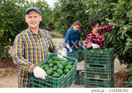 Smiling successful man farm owner holding local ripe avocados in hands during harvesting season