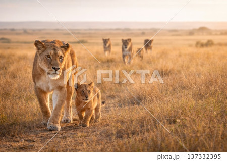 Lioness walking with cub and pride in African savanna at sunset