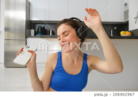 Portrait of fitness instructor, woman with headphones and smartphone, dancing at home, workout inside her house, wearing blue sportsbra