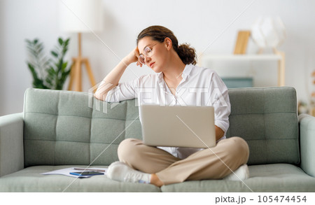 Lazy woman room. Apathetic sad girl relax lying on couch untidy apartment home disorder with dirty socks or trash, indifference women depression concept classy vector illustration
