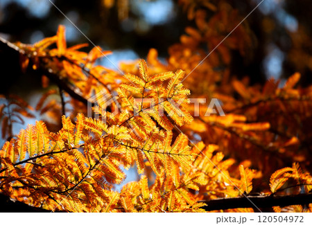 美しい紅葉の景色 陽に輝くメタセコイヤの美しい紅葉