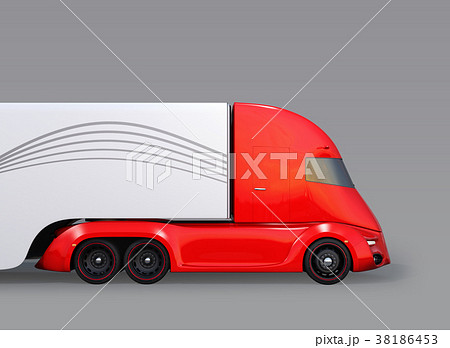 グレイ背景にメタリックレッドの自動運転電動セミトラック
