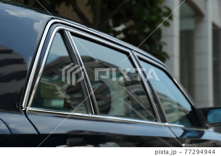 乗用車のサイドウインドーとボディーに夕方の景色が映っている構図