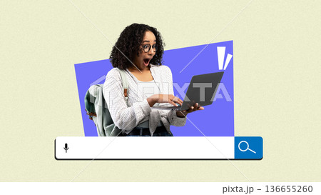 A woman with curly hair is sitting with a laptop. She looks surprised while searching online. The background is a collage with different colors and shapes.