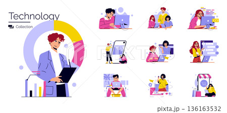 Technology collection vector illustration showing diverse characters interacting with digital devices, coding, and engaging in online activities, highlighting modern digital lifestyles.