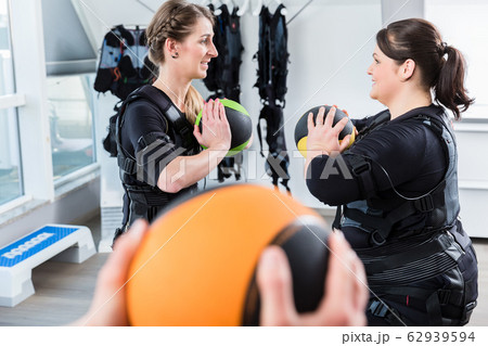 スポーツジムでトレーニングする若い女性 腹筋 メディシンボール