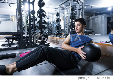 スポーツジムでトレーニングする男性 腹筋 メディシンボール