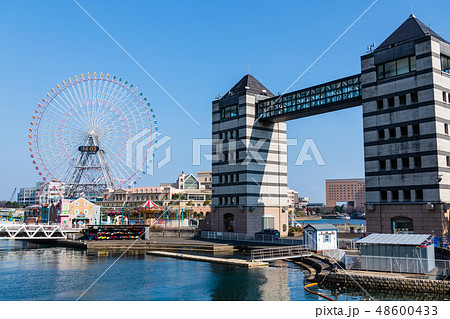日本のの横浜都市景観 陸に上がるスカイダックバスなどを望む。画面右は桜木町駅