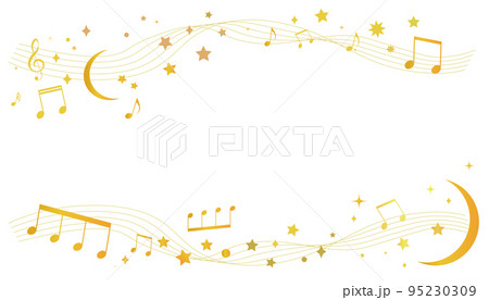 星と月を散りばめた夜空をイメージした楽譜のフレームイラスト ゴールド 五線譜 背景イラスト