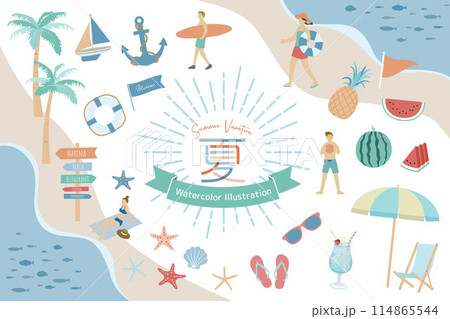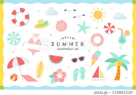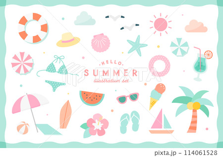 夏のアイテムのイラストセット 海 夏休み ビーチ シンプル かわいい 南国 リゾート 旅行 バカンス