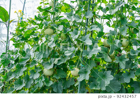 Green fresh organic melon farm inside greenhouse