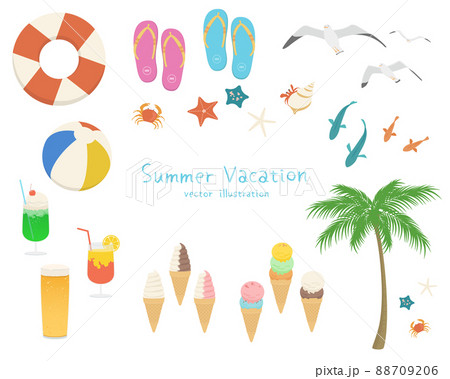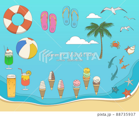 夏のアイテムのイラストセット 海 夏休み ビーチ シンプル かわいい 南国 リゾート 旅行 バカンス