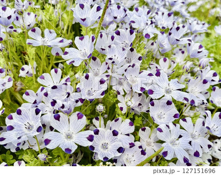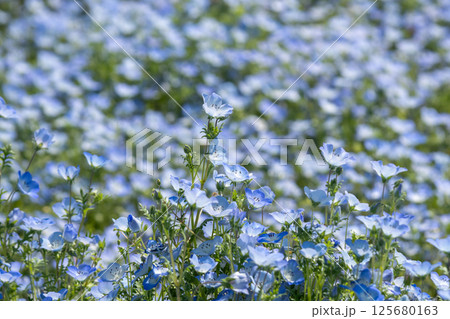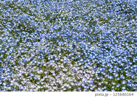 愛らしい青や白の花が咲く春のネモフィラ畑