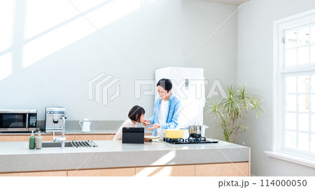タブレットでレシピを見ながら料理をするパパ、ソファでリラックスする主婦と子供