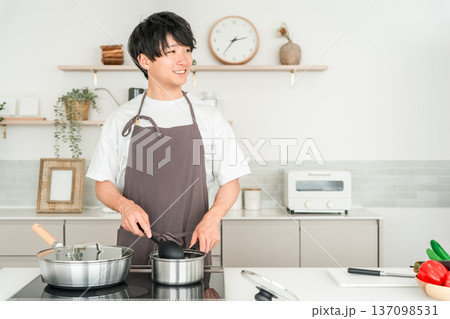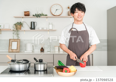 キッチンで料理するエプロン姿の若い男性 料理男子イメージ