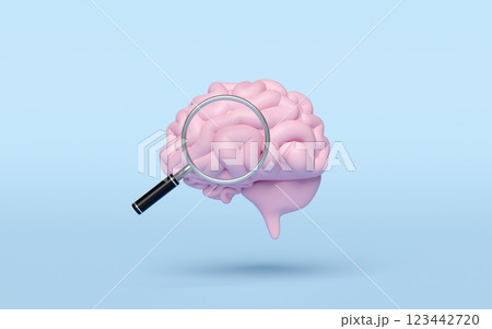 3d pink brain icon with magnifying glass isolated on blue background. health check concept, 3d illustration render