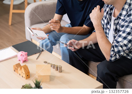LGBT Relationships and Saving Goals. Partners collaborating on a savings plan, strategizing their financial future at home.