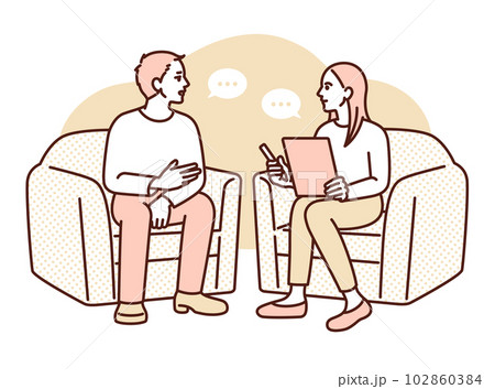 メンタル心理カウンセラーに悩みを打ち明けるビジネスパーソンのイラスト素材。