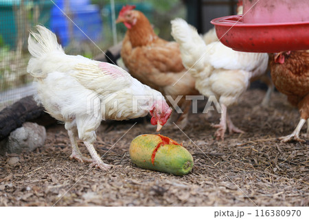 Chicken eating papaya in local farm