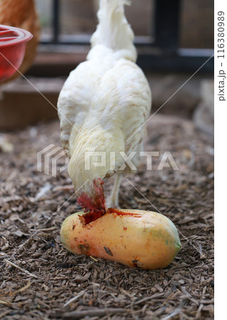 Chicken eating papaya